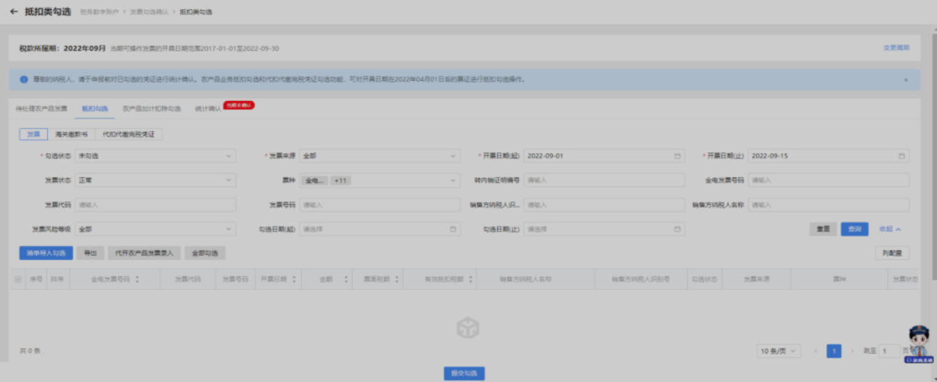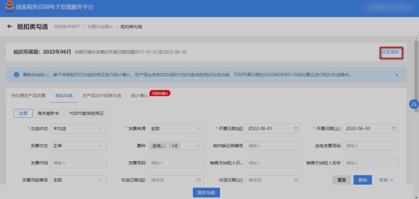 税款所属期变更成功后,系统提示“操作成功”,返回抵扣勾选业务界面,税款所属期自动刷新。